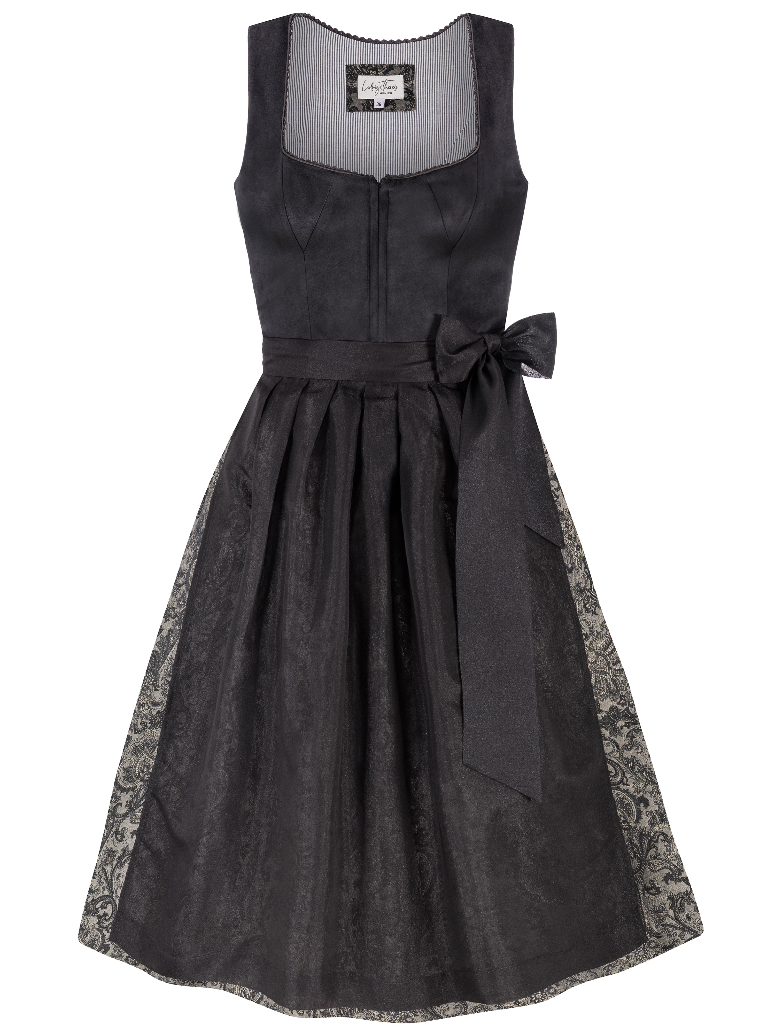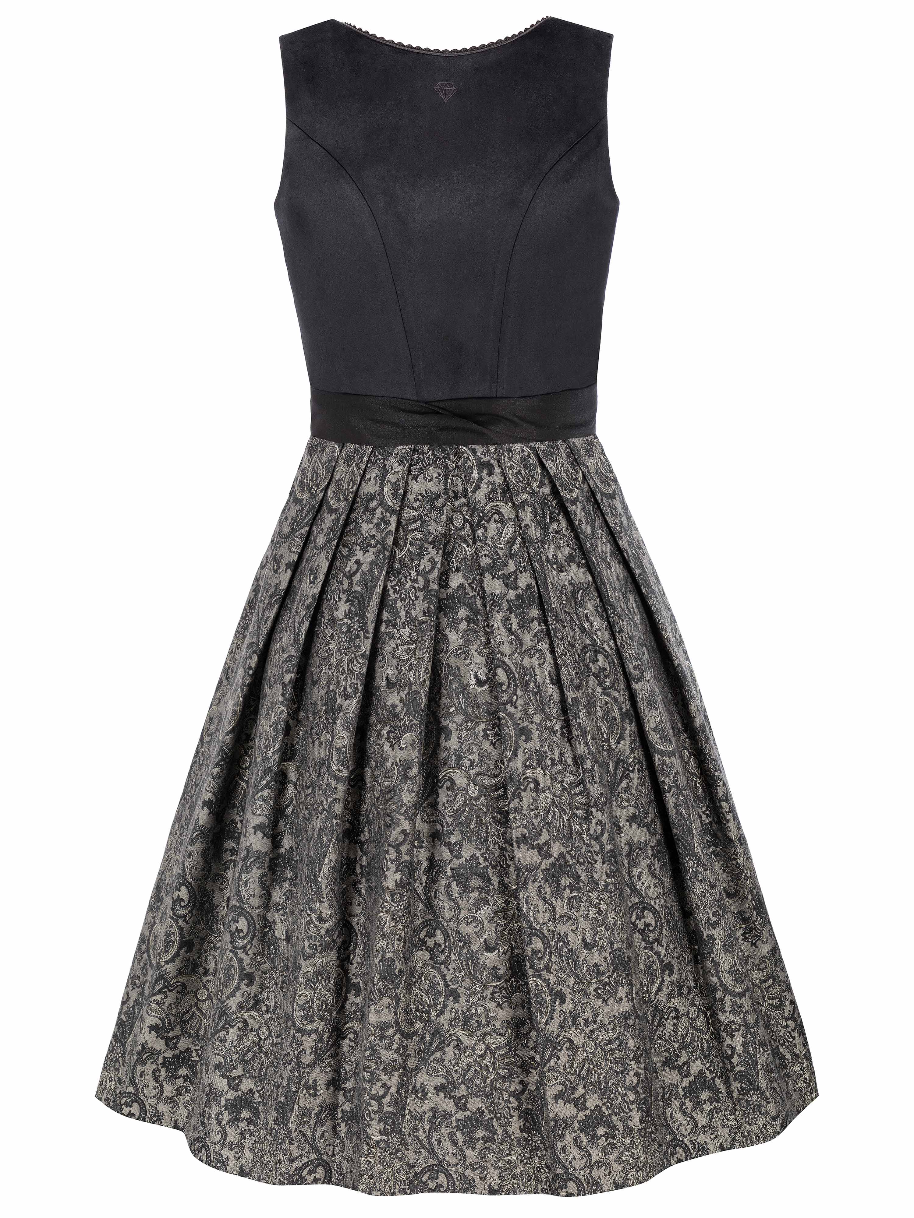 Dirndl Kassandra verbindet modernen Glamour mit puristischer Eleganz. Samt, strukturierter Jacquard und eine subtil glitzernde Schürze schaffen einen stilvollen Look in tiefem Schwarz mit hochwertigem Fashion-Appeal.