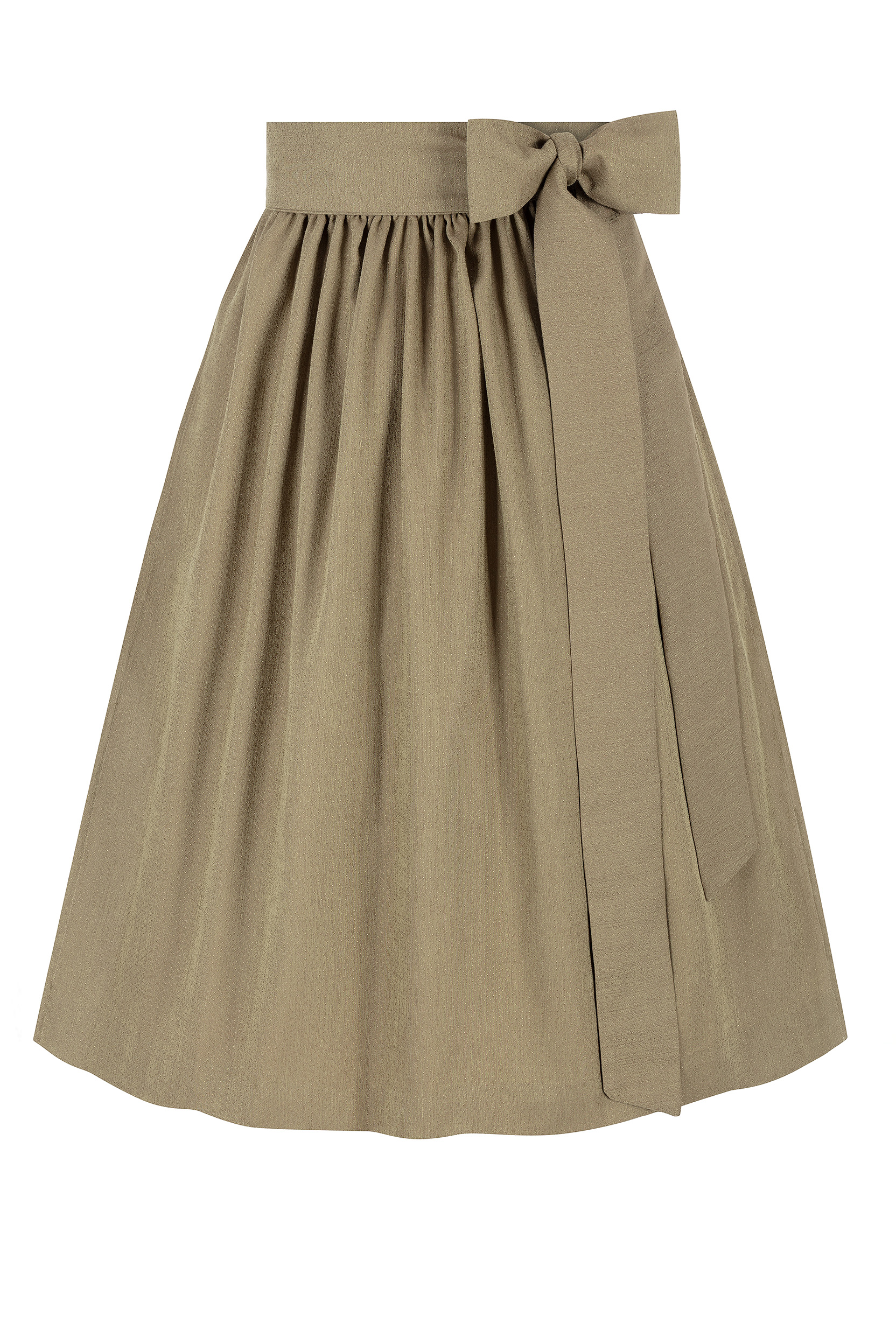Die Dirndlschürze Evelyn in 70 cm Länge überzeugt mit ihrer schlichten, eleganten Ausstrahlung. Der fein strukturierte Stoff in Oliv sorgt für einen edlen Look und lässt sich vielseitig kombinieren. Die breite Schleife rundet das Gesamtbild stilvoll ab.