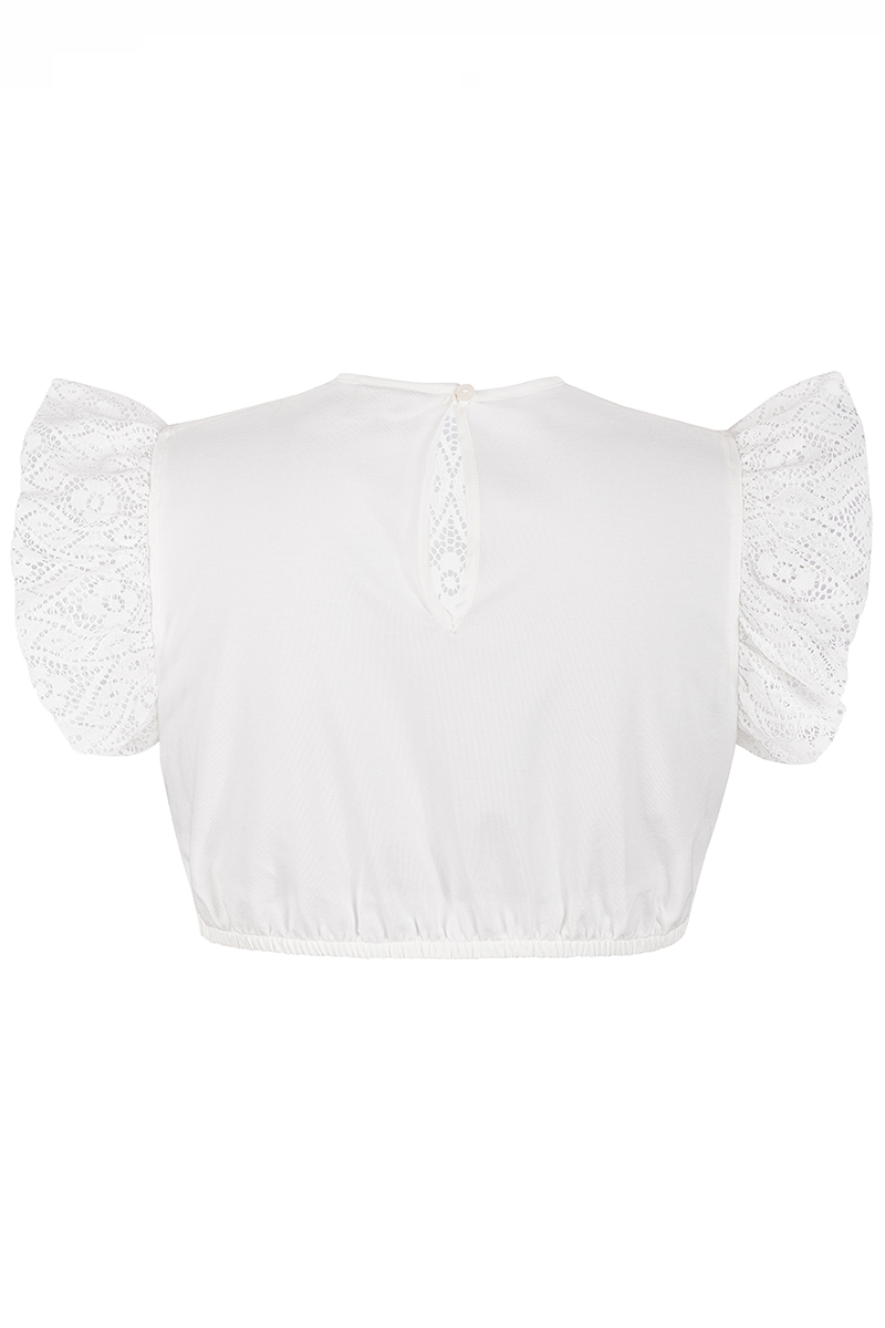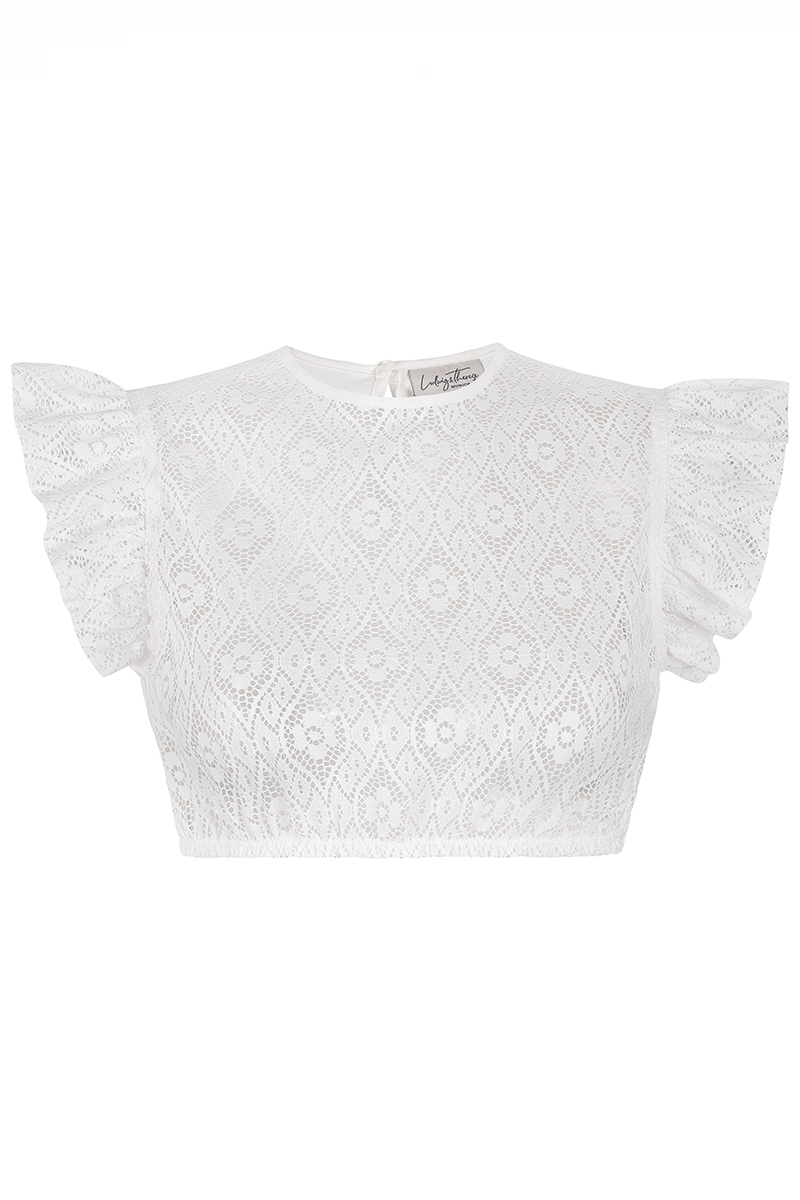 Die Dirndlbluse Antonella wirkt verspielt, feminin und elegant zugleich. Der feine Spitzenstoff mit ornamentalem Muster verleiht der Bluse eine luftige Leichtigkeit, während der runde Ausschnitt und die voluminösen Flügelärmel das Design romantisch abrunden – zart, modern und stilvoll.